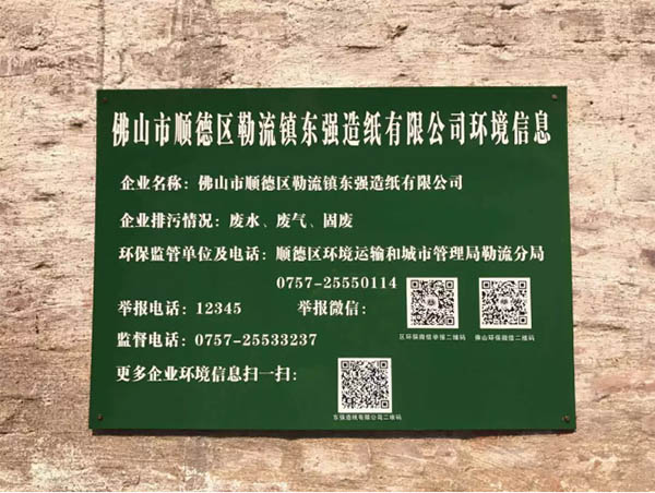 在佛山市顺德区勒流镇东强造纸有限公司(以下简称“东强造纸公司”)的门口,一块绿色的牌匾尤为显眼。牌匾上,企业名称、排污情况、环保监管单位及电话、监督电话、企业的排污许可证二维码等信息一目了然。